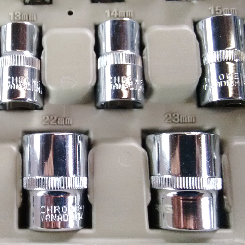 :: 15 Soquetes com Encaixe de 1/2 Pol. tamanhos: 10, 11, 12, 13, 14, 15, 17, 18, 19, 20, 21, 22, 23, 24, 27mm
