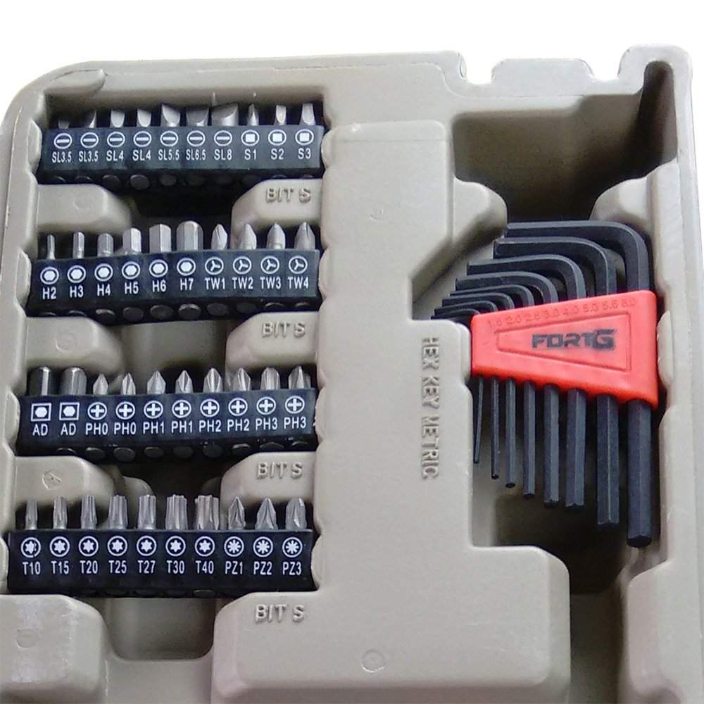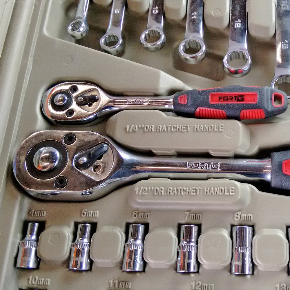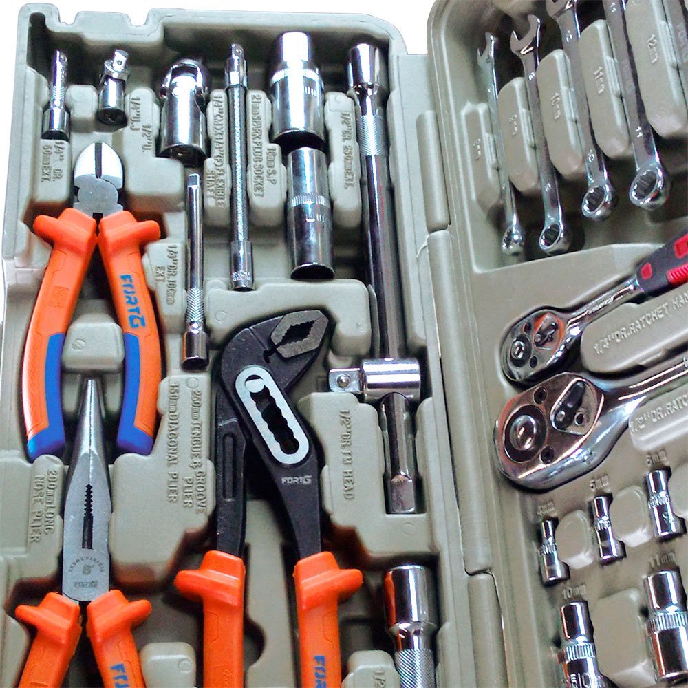 Kit de ferramentas composto por 110 peças, fabricadas com material resistente proporcionando durabilidade e eficiência.